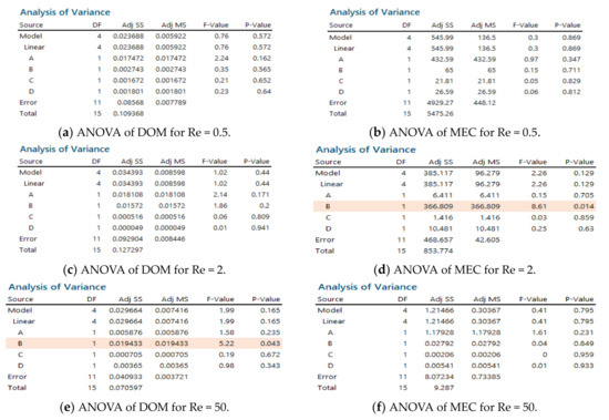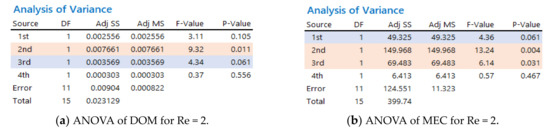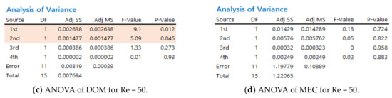 The mixing performance was analyzed further using analysis of variance (ANOVA) to evaluate the statistical significance of the four combination schemes; Minitab 19 [30] was used for ANOVA. Figure 11 summarizes the results for Re = 0.5, 2, and 50. Here, Adj SS stands for the adjusted sum of squares, and represents a measure of variation from the mean. Adj MS indicates the mean squares, which represents an estimate of the population variance. This was calculated by dividing the corresponding sum of squares by the degrees of freedom. The F-value is the test statistic used to determine if the term is associated with the response. The p-value is the probability that measures the evidence against the null hypothesis. When the p < 0.05, the corresponding factor was statistically significant; p < 0.05 guarantees a 95% probability of statistical significance. The combination scheme (B) had significant effects on mixing for Re = 2 and 50, p = 0.014 for Re = 2 and p = 0.043 for Re = 50. This suggested that mixing in the regime of molecular diffusion dominance was affected negligibly by the combination order of mixing units. In contrast, it played a significant role the mixing regime of transition and advection dominance.