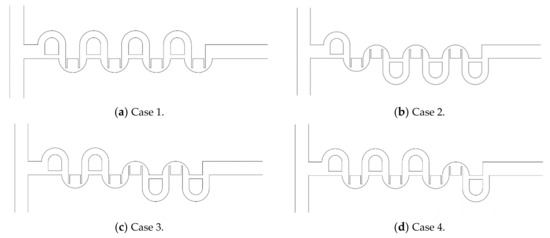 The general combination scheme was assessed by comparing the mixing performances of the four different combinations based on the same number of mixing units. Figure 16 shows the four combinations that adopted the combination scheme in every combination unit (different mixing units in each combination unit). On the other hand, cases 2, 3, and 4 did not adopt the general combination scheme completely; it was not adopted at one junction of the combination units. The mixing unit (MC-B) was repeated in the second and third mixing slots of case 2, even though it used different mixing units in all combination units. On the other hand, case 1 adopted the general combination scheme throughout the whole mixer; different mixing units were used in any two consecutive mixing slots.