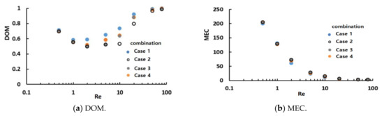Figure 17 compares the mixing performance of the four different combinations in terms of the DOM and MEC. As expected, case 1 showed the best DOM throughout the entire range of Reynolds numbers. The enhancement of case 1 from the other combinations was noticeable, particularly in the range of Re = 1 to Re = 20. This suggested that the general combination scheme played a significant role in the mixing regime of transition; it also played a role in the mixing regime of advection dominance. In contrast, the effects of a combination order were negligible in the mixing regime of molecular dominance; the Reynolds number was less than or equal to approximately 1. Figure 18 compares the DOM increments of the four cases in each combination unit for Re = 2. Cases 2, 3, and 4 showed a smaller increase in DOM in the combination unit joined to the next combination unit without adopting the general combination scheme. This result confirmed that the general combination scheme should be adopted to enhance the mixing performance at the junction of two combination units and in each combination unit.