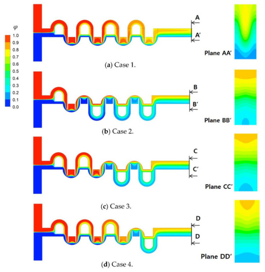Figure 19 compares the mass concentration distribution of the four combined micromixers at the plane of the mid-width, z = 60 μm, and at the outlet plane. Although they combined the same number of mixing units, the evolution of mixing and the mass concentration of fluid A at the outlet plane were entirely dependent on how they were combined. Because case 1 adopted the general combination scheme throughout the entire micromixer, its mass concentration of fluid A at the outlet plane showed the most mixed distribution, compared to the other cases. This confirmed the significance of the general combination scheme in a combined micromixer.