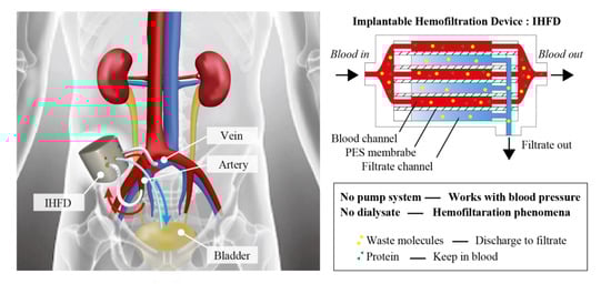 Concept of implantable hemofiltration device (IHFD). The device is connected to artery and vein and removes water and wastes from blood by hemofiltration. The filtrate is brought to bladder and discarded as urine. IHFD works with blood pressure and does not require a pump system. IHFD, which continuously removes water from chronic kidney disease patients, reduces the frequency of their hospital visits, alleviates the water intake restriction, and thus, drastically improves their quality of life.