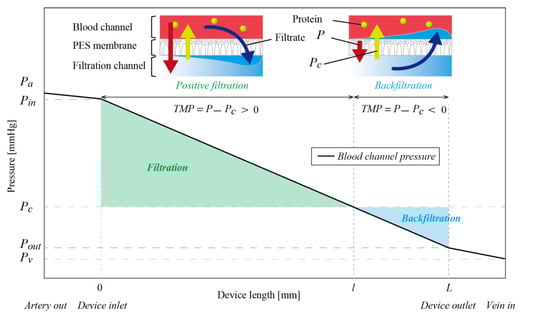 In this paper, we discuss a channel design that takes backfiltration into consideration. The pump-free IHFD works using the difference between arterial and venous pressures. Venous pressure depends on position and posture, and is typically around 20 mmHg [8] in normal cases, while arterial pressure is around 80 mmHg. Oncotic pressure, produced by the presence of protein in blood, is around 30 mmHg. Therefore, as shown in Figure 2, TMP decreases along the filtration channels and becomes negative from a certain point. Where TMP is negative, filtrate returns to the blood in a process termed “backfiltration” [9,10]. Backfiltration has been studied in hemodialysis applications in the context of contaminants in the dialysate being brought back to the blood, which is not the case for the IHFD.