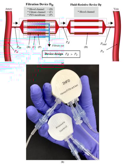 The fluid-resistive device DF was designed to include only blood channels. The channel design was identical to that of the hemofiltration device DH for the ease of fabrication. By serially connecting DF after DH, the pressure drop across the two devices was divided as designed in both in vitro and ex vivo experiments. In the ex vivo experiments, pressure at the outlet of DF may be larger than the oncotic pressure . If this is the case, even without DF, TMP inside DH is always positive and no backfiltration will take place. However, note that large pressure drops between and and between and were generated. This was caused by the extension tubes and indwelling needles that bridge the femoral artery and DH and the radial cutaneous vein of the forearm and DF [26]. Within vivo experiments, the IHFD will be placed in the vicinity of the artery and vein (in the case of humans, the internal iliac artery and external iliac vein will most likely be used [27,28]) and connected to vessels with minimum pressure loss. and will be close to and , resulting in . Therefore, the fluid-resistive device DF is necessary.