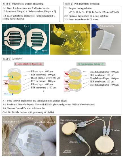 Fabrication process of the hemofiltration device and the fluid-resistive device. Microfluidic channels with adhesives are laser cut to have two patterns, as shown in the Step 1. PES membranes are formed by the liquid inversion method (Step 2). The devices are formed by bonding the channels and PES membranes alternatively, where they are aligned with a jig. PES membranes are known to be asymmetric and have nanopores on one side and micropores on the other side. Note that the blood (or sample) channels contact with nanoporous side of the membrane.