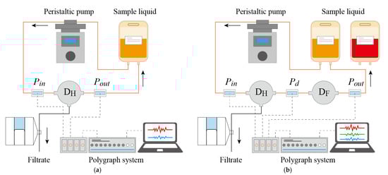 Figure 5 shows the in vitro experimental setup: a perfusion circuit was designed to contain a peristaltic pump (Peri-Star Pro; World Precision Instruments, Sarasota, FL, USA), extension tubes (SF-ET2022L; Terumo Corporation, Tokyo, Japan), and hemofiltration devices DH and DF. Instead of blood, saline solution (Otsuka Pharmaceutical, Tokyo, Japan) with albumin (FUJIFILM Wako Pure Chemical Corporation) was used for samples. and were measured with pressure transducers (DX-100; Nihon Kohden Corporation, Tokyo, Japan) and a polygraph (RMT-1000MG; Nihon Koden Corporation, Tokyo, Japan) and controlled by the peristaltic pump. Filtrate was stored in a tube and the amount of filtrate was calculated from the movement of the front edge of the filtrate in the tube.