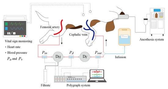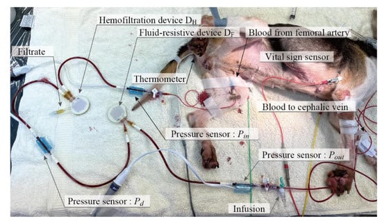 The processes for preparing DH and DF are detailed below. Saline was circulated using a peristaltic pump to remove air bubbles from the blood and filtrate layers. The devices were then placed in a container filled with saline to prevent drying and sterilized with gamma rays at 10 kGy [24]. Before starting the experiment, the hemodiafiltration device was connected to a pressure control device, a blood pressure monitor, and a 3.1 mm diameter extension tube, then a three-way stopcock (Terumo Corporation, Tokyo, Japan) was attached to both ends. The inside of the device was filled with a solution of 5000 units/5 mL of Na-heparin injection (Mochida Pharmaceutical Co. Ltd., Tokyo, Japan) mixed with saline in a ratio of 1:9. Beagle dogs were anesthetized by suction anesthesia, and the device was connected by puncturing the radial cutaneous vein of the foreleg and the femoral artery using an indwelling needle. The experimental setup is depicted in Figure 6. At the same time, 2 mL of blood was drawn from the arterial three-way stopcock using a syringe and heparin was administered from the venous three-way stopcock. The collected blood was transferred to a Venoject II vacuum blood collection tube (Terumo Corporation, Tokyo, Japan) for storage. After confirming that the device was filled with blood, filtrate collection and blood pressure monitoring were started. After completion of the experiment, 2 mL of blood was collected from the three-way stopcock on the arterial side using a syringe. The collected blood and filtrate were subsequently analyzed for albumin, total protein, urea nitrogen, and creatinine using a dry clinical chemistry analyzer (Spot-Chem EZ SP-4430; Arkray, Kyoto, Japan) and for electrolyte concentration using an electrode electrolyte analyzer (Spot-Chem EL SE-1520; Arkray, Kyoto, Japan). Total protein concentration was used to calculate the oncotic pressure.