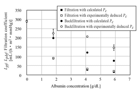 The relationship between filtration coefficient and albumin concentration obtained is shown in Figure 7 (for date, see the supplemental material). The calculated and experimentally deduced showed discrepancies, which were found to particularly affect . is larger than , which indicates that even small regions of negative TMP lead to reductions in filtrate. Both and decreased with albumin concentration, which was considered to reflect fouling of albumin, as albumin molecules blocked some of the nanopores in the PES membrane. This was observed in our previous work [5,25]. Fouling only takes place on the saline channel side, since the albumin molecules are larger than the nanopores of the PES membrane and thus are not present in the filtrate. In the case of backfiltration, the filtrate returns from the filtrate channel to the saline channel, which can lead to alleviation of the fouling. This explains why was larger than and the discrepancy increased with albumin concentration.