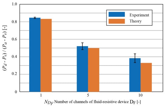 Figure 8 shows the ratio of pressure loss across the hemofiltration device DH to that across the fluid-resistive device DF (for date, see the supplemental material). The theoretical value was deduced from Equation (6). was 5 and varied between 1, 5, and 10. Volumetric flow rates of 5, 10, 15 mL/min were tested. Discrepancies between experimental and theoretical values were considered to originate from pressure losses at the inlets and outlets. Saline solution was introduced to the device with a tube, then divided into the channels. This causes a pressure loss and depends on the geometry and the number of channels.