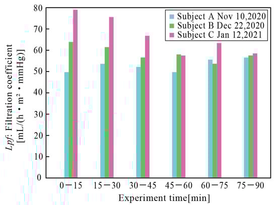 Filtration coefficients in the ex vivo experiments with respect to experiment time. Filtrate was collected every 15 min. No significant decreases or fluctuations were observed. Filtration coefficients are comparable to those from in vitro experiments with an albumin concentration of around 2 g/dL.