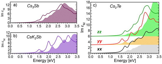 - Amador, R.; Saßnick, H.D.; Cocchi, C. Electronic structure and optical properties of Na2KSb and NaK2Sb from first-principles many-body theory. J. Phys. Condens. Matter 2021, 33, 365502. [Google Scholar] [CrossRef] [PubMed]