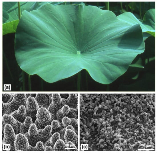 The superhydrophobic surface of lotus leaf; (a) general image of lotus leaf; (b) SEM image of the upper leaf side (a hierarchical surface structure consisting of papillae, wax clusters and wax tubules); (c) SEM image of wax clusters on the upper leaf side [].