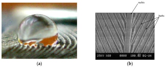 The superhydrophobic surface of bird feathers []; (a) general image of water droplets placed on bird feathers; (b) SEM image of the central part of a bird feather. Scale bar is 100 µm.