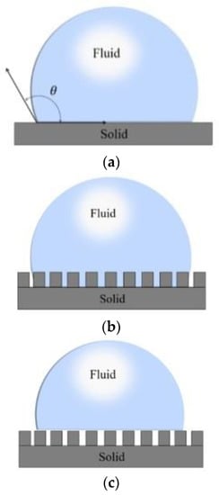 Young first established the Young’s model [], according to which the surface of the material is smooth (ideally), the WCA between the liquid droplet (usually a water droplet) and the smooth material surface is constant, as shown in Figure 3a, and its size depends on the surface free energy. Barthlott [] outlined more than 200 water-repellent plant species with WCAs greater than 150° and their surface morphologies. However, in the real world, absolutely smooth material surfaces do not exist. The actual material surface shows a certain degree of roughness, and the roughness has a very significant influence on the wettability. Therefore, Wenzel [] improved Young’s model (Figure 3b), in which the liquid droplets completely fill the grooves on the rough surface. The model shows that due to the presence of the rough surface, the actual solid–liquid contact surface is larger than the area observed in the apparent geometry, thus enhancing the hydrophobicity. Furthermore, Cassie believed that there was air in the grooves of some rough surfaces, and liquid droplets could not fill the grooves, so the material surface should be composed of solid and gas (Figure 3c) []. The contact interface of liquid on the material surface included solid–liquid and gas–liquid contact interface. By increasing the gas–liquid contact area and reducing the proportion of solid–liquid contact area, a larger WCA could be obtained.