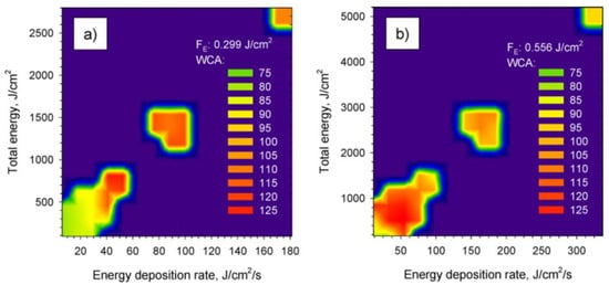 Wang et al. [] studied the effect of ultra-short femtosecond laser pulses on the surface hydrophobicity of polymer polymethyl methacrylate (PMMA), and found that the change in surface wettability was highly dependent on the energy deposited on the surface of PMMA. Figure 4 plotted the WCA as a function of the energy deposition rate and the total energy deposited on the PMMA surface. At a lower laser fluence of 0.299 J/cm2, WCA increased and exceeded 90° while the total deposited energy accumulated was above 300 J/cm2. When the total energy increased to the range of 600–900 J/cm2, the WCA exceeded 120° (the maximum was about 125°). When the total energy was greater than 900 J/cm2, the WCA decreased with the increase in the total energy. In addition, Figure 4a,b also shows that the optimal energy deposition rate to achieve the maximum WCA was about 50 J/cm2/s during a single scan of the laser beam.