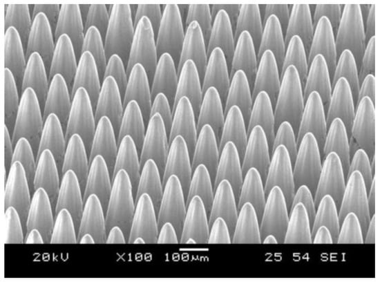 Micro-pins array fabricated on stainless steel sheet (AISI 304, 3 mm × 3 mm) by the process of LBM [].