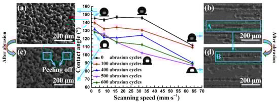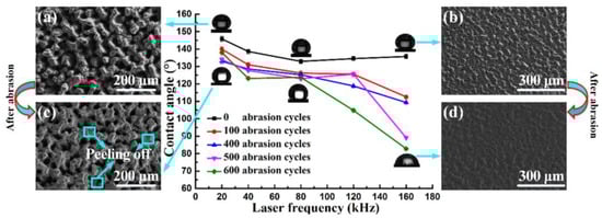 Xiao et al. [] proposed a new method, based on liquid-phase laser ablation, to obtain a strong hydrophobic surface. In this method, a cemented carbide sample was immersed in a fluorosilane solution, the distance between the top surface of the sample and the liquid surface was controlled by laser ablation, and a surface with good hydrophobicity could be obtained. They studied the influence of processing parameters on the wettability of the machined surface (Figure 6 and Figure 7). As shown in Figure 6, the destruction of the hydrophobic structure led to a decrease in the WCA. Compared with the WCA before wear, the WCA after 600 times of wear at different frequencies was reduced by 5.4%, 11.2%, 6.9%, 22.1%, and 39%, respectively. This indicated that the smaller the laser frequency, the smaller the decrease in the WCA. In particular, when the frequency was between 20 and 80 kHz, as the number of wear increased, the WCA did not change significantly. This confirmed that the hydrophobic surface prepared in this frequency range was more stable and durable. As shown in Figure 7, the WCA at different scanning speeds was reduced by 11.7%, 13.4%, 20.9%, 22.8%, and 20.4%, respectively, compared with that of the unworn surface after 600 wear cycles []. The hydrophobic surface fabricated at a relatively low scanning speed was more stable than the surface fabricated at a higher scanning speed.