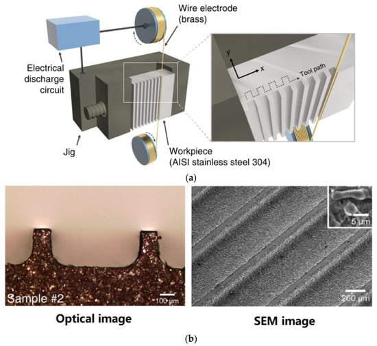 Bae et al. [] proposed a direct method of wire EDM (WEDM) to process micro-channels on the surface of stainless steel (AISI 304) to achieve wettability control. Figure 8 demonstrates the schematic illustration of the WEDM process and the machined sample. As depicted in Figure 8a, a commercial WEDM system was used to manufacture a micro-grooved wettability-controlled surface (electrode wire diameter: 250 μm). As shown in Figure 8b, of the manufactured sample, the sharpness of the corners of the ridges was relatively satisfactory. Since the processed electrode was a linear electrode (a circular cross-section), the corners of the groove had a circular shape. The experimental results showed that, through the WEDM process, a solid stainless steel surface with controllable wettability could be achieved. In order to enhance the hydrophobic and lipophilic properties, the depth of the microgrooves should be large enough. More importantly, the controllable wettability of stainless steel came from surface patterning without any additional chemical treatment on the machined surface, which is conducive to low-cost industrial application.