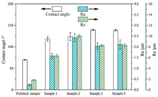 He et al. [] investigated the anti-fouling effects of EDM machined hierarchical micro/nano structure (HMNS). Figure 9 depicted the relationship between the roughness (Ra and Rz) and the WCA of samples machined by the process of EDM. Among them, surface roughness Ra is the arithmetic mean deviation of the surface profile, the arithmetic mean of the absolute value of the profile deviation within the sampling length, and surface roughness Rz is the 10-point height of microscopic unevenness, the sum of the average of the 5 largest profile peak heights and the average of the 5 largest profile valley depths within the sampling length. As shown in Figure 9, with the increase in discharge current, more micro/nano structures were processed, resulting in an increase in roughness (Ra and Rz). However, with the further increase in the discharge current, the surfaces of samples 3 and 4 had more recast areas and molten balls than sample 2, resulting in a decrease in roughness (Ra and Rz). In addition, the WCA became larger as the discharge current increased. The experimental results showed that the modified surface of EDM had a hierarchical micro/nano structure. These micro/nano structures made the surface hydrophobic, thereby improving corrosion resistance and pollution resistance. With the increase in the discharge current in the process of EDM, the WCA increased. Therefore, this improved the anti-fouling performance and the fouling induction period of the hierarchical micro/nano structure.