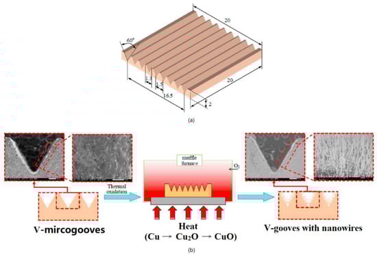 Schematic of the manufacturing process for the V-shaped microgrooves; (a) geometric dimensions; (b) schematic of the thermal oxidation process [].