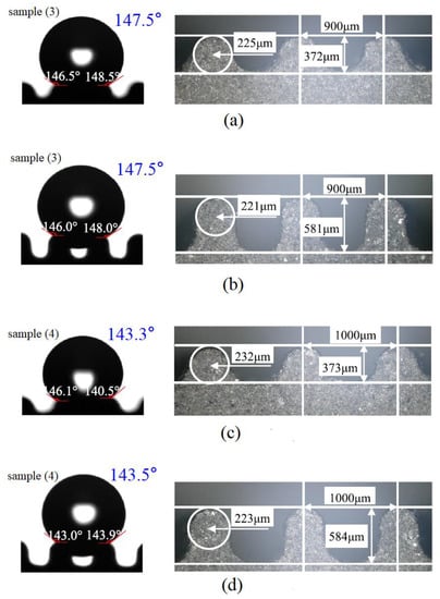 Chen et al. [] used the WEDM to fabricate a superhydrophobic structure on the surface of the SiCp/Al composite material. Figure 11 depicts the relationship between the designed parameters (radius and center distance) of the groove and the contact state. As depicted in Figure 11, the contact angles of the deep groove samples of (3) and (4) were basically equal to the original samples. In addition, when the semicircular groove had a sufficient height, the contact states of the droplets on both the samples (3) and (4) were in the Cassie–Baxter state. In addition, the experimental results showed that the maximum contact angle of the prepared microstructure (without other surface modification treatments) could reach 153.3°. This indicated that the surface of the composite material with superhydrophobic structure could be fabricated by the WEDM, and it had good wear resistance.