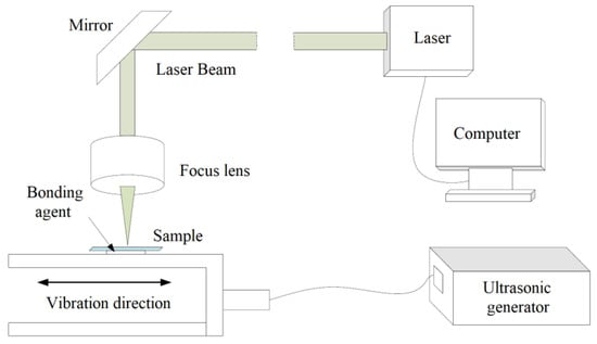 Ultrasonic machining has developed rapidly in the past decades, and it is not limited by whether the material is conductive or not. The macroscopic force of the tool on the workpiece is small, as is the thermal effect. Therefore, in the field of difficult-to-process materials, many key process problems have been solved, and good results have been achieved [,,,]. Chen et al. [] used ultrasonic machining to treat the surface of polycarbonate material after laser processing, and studied its surface wettability. Experimental results showed that after ultrasonic treatment, the superhydrophobic surface and hydrophobic properties were reduced, but the surface remained hydrophobic. In order to obtain the gas diffusion layer of the proton exchange membrane fuel cell, Guo et al. [] constructed a hydrophobic and hydrophilic synergistic surface with ultrasonic atomization spray technology. Liang et al. [] used micro-ultrasonic powder molding to fabricate micro-plastic parts with hydrophobic surfaces. The experimental results showed that the micro-plastic parts had good surface hydrophobicity (WCA = 135.4°). Zhao et al. [] reported an ultrasonic vibration-assisted laser composite machining, depicted in Figure 12, to fabricate superhydrophobic copper surfaces. The experiments showed that the WCA of the superhydrophobic copper surface was 157.4° (under 3 μL water). Chen et al. [] used rubber bands (RB) and low-cost carbon black nanoparticles (CBNPs) as polymer matrix and conductive nano fillers to prepare conductive polymer composite with superhydrophobic for wearable strain sensors. Under the action of ultrasound, the CBNPs were evenly distributed on the surface of RB.