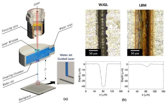 Schematic of the WJGL process and machined results; (a) schematic diagram of the WJGL process; (b) comparison of machined contour between the processes of WJGL and LBM [].