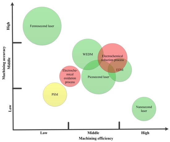 Figure 15 compares the machining efficiency, machining accuracy, machining cost, and environmental impact of different non-traditional machining methods for superhydrophobic surfaces. For example, the cost of a picosecond laser is significantly better than that of a femtosecond laser, and the production efficiency of picosecond laser processing is higher than that of a femtosecond laser. Moreover, the machined hydrophobic micro-structure is stable, and the shape is controllable by the picosecond laser. However, the disadvantage is still that the economy is not ideal, and it does not have a cost advantage in large-scale production. In recent years, nanosecond laser processing technology has attracted much attention due to its efficient processing speed. However, the thermal effect of nanosecond laser processing will cause many difficult problems such as recast layers, cracks, and self-organized structures, which will seriously affect the quality and performance of the fabricated superhydrophobic surface. In addition, compared with other machining methods, the EDM process is a green machining method with less pollution and low cost, which has the potential to prepare surfaces with excellent antifouling performance [,,].