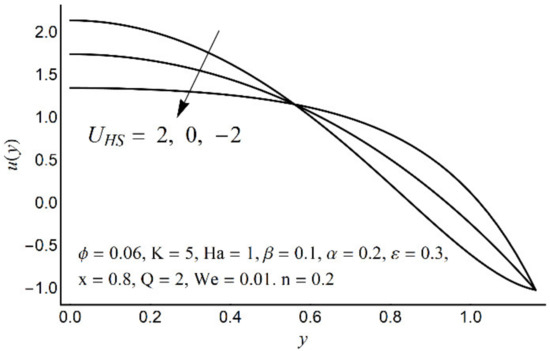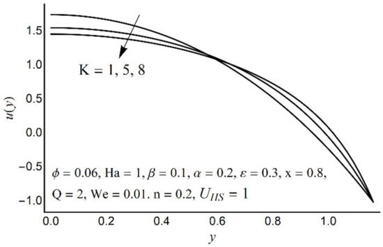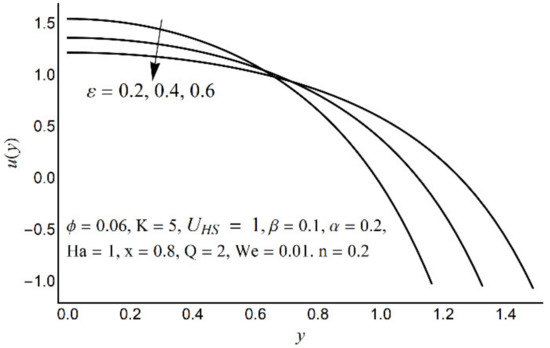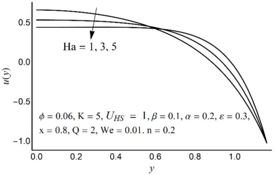 Figure 2, Figure 3, Figure 4 and Figure 5 describe the modifications in the axial velocity profile u(y) when different values of the Hartmann number (Ha), Helmholtz-Smoluchowski velocity parameter (UHS), Debye-Hückel parameter (K), and cilia length parameter (ε) are selected. Figure 2 reveals that an elevated value of Hartmann number (Ha) decelerates the fluid motion in the environs of the channel center and boosts near the channel boundary. Furthermore, this upsurge (in the Hartmann number) develops a more flattened pattern of velocity distribution close to the channel center. This declining conduct of Ha on fluid stream is due to the electromotive force which is linked to the magnetic force. The induced force possesses the ability to defy the fluid flow in the channel deep zone. But in a wavy channel, in order to preserve a constant flow rate, an utterly inverse state can be encountered near the channel boundaries. Figure 3 concluded that induction of Helmholtz-Smoluchowski velocity UHS in the flow direction enhances the fluid velocity. The same intensity of Helmholtz-Smoluchowski velocity, when applied in the reverse direction, produces a deceleration in fluid velocity especially in the center of the channel. The impact of the electroosmotic parameter (K) on the velocity field is shown in Figure 4. From the figure, it is observed that the large values of K reduce the fluid velocity at the center of the channel and hinder the velocity in the locality of the ciliated boundary. This conduct is quite expected since an increase in Debye thickness results in a strong electric double layer. Thus, the fluid velocity reduces at the channel center. However, near the wall of the channel, an entirely reverse behavior is noticed which signifies the momentum balance inside the channel. Figure 5 depicts that the prolonged cilia obstruct the flow in the deep channel region and exhibit trivial effects close to the ciliated wall. This behavior emerges as the cilium whip is directly proportional to its length. Therefore, a high value of the cilium length parameter proposes a considerable drop in fluid flow in the core channel region.