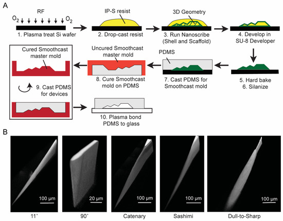 - Desai, S.P.; Freeman, D.M.; Voldman, J. Plastic masters-rigid templates for soft lithography. Lab Chip 2009, 9, 1631–1637. [Google Scholar] [CrossRef] [PubMed] [Green Version]