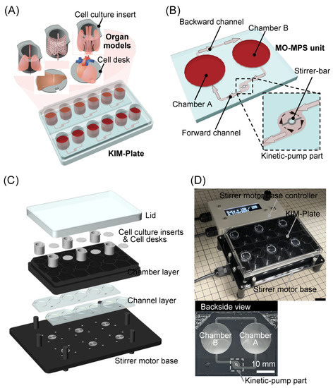 Figure 1. Kinetic pump integrated microfluidic plate (KIM-Plate) for multiorgan cell culture. (A) Conceptual diagram of the KIM-Plate. The KIM-Plate has a simple structure mimicking a 24-well plate, allowing easy handling. (B) The multiorgan MPS (MO-MPS) unit consists of two culture chambers and microfluidic channels. The stirrer-based kinetic pump is integrated in a forward channel for medium perfusion. (C) The KIM-Plate consists of a lid, a chamber layer, and a channel layer and is set on a stirrer motor base to control the kinetic pump and perfuse culture medium. (D) Photograph of the KIM-Plate and stirrer motor base system. The KIM-Plate was fabricated by laser fusion of the polystyrene channel and chamber layers. Motor rotation of the stirrer motor base can be controlled by a controller.