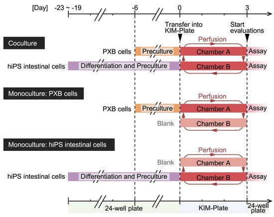 A cell desk (MS-0113K, Sumitomo Bakelite Co., Ltd., Tokyo, Japan) and culture insert (353495, Falcon, New York, NY, USA) were used as cell culture substrates in the KIM-Plate. PXB cells (PhoenixBio Co., Ltd., Higashihiroshima, Japan) and hiPS intestinal cells (provided by FUJIFILM Co., Ltd., Tokyo, Japan) were seeded on the cell desk and culture insert, respectively, and differentiated and precultured in conventional 24-well plates.
