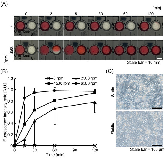 The kinetic pump was driven from 0 to 6500 rpm to study the transportation of red dye and evaluate the circulatory function of the kinetic pump. For the transportation experiment, a red dye solution was introduced into chamber A and ultrapure water was introduced into chamber B of the KIM-Plate, the kinetic pump was driven at 6500 rpm for 120 min, and the transportation of the red dye was evaluated. For the control experiment, the red dye transportation was examined at a stirrer rotation speed of 0 rpm. Furthermore, the transportation of Lucifer yellow CH Dipotassium Salt (LY, 12806271, FUJIFILM Wako Pure Chemical Co., Osaka, Japan) was quantitatively evaluated. For this experiment, 10 µM of LY solution was introduced into chamber A and ultrapure water was introduced into chamber B of the KIM-Plate. The fluorescence intensities of the samples collected at 0 to 120 min were measured using a microplate reader (SH-9000, CORONA Electric Co., Ltd., Hitachinaka, Japan), and the ratio of the fluorescence intensity of chamber B to that of chamber A was determined.