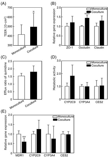 Figure 4. Evaluation of the effects of coculture on the function of human induced pluripotent stem cell derived small intestinal epithelial cells (hiPS intestinal cells). (A) Transepithelial electrical resistance (TEER) value of hiPS intestinal cells on day 3. The TEER value was significantly increased by coculture (n = 23–26). (B) The relative gene expression levels associated with tight junctions in hiPS intestinal cells. The gene expression levels tended to increase with coculture (n = 5–6). The gene expression levels were normalized to those of the monoculture. (C) Efflux ratio (ER) of quinidine, a P-glycoprotein (P-gp) substrate. The ER values were not significantly different between the coculture and monoculture (n = 3). (D) Metabolic activities of CYP2C9, CYP3A4, and CES2 in hiPS intestinal cells. The metabolic activities were not significantly different between the coculture and monoculture. Each value was normalized to the enzyme metabolic activities of the monoculture (n = 6). (E) The relative gene expression levels in hiPS intestinal cells. The expression level of MDR1 was significantly decreased by coculture, and there were no significant differences in the expression levels of other genes (n = 5–6). Each value was normalized to that in the monoculture for each gene. Data represent the mean ± SD, * p < 0.05, ** p < 0.01, and *** p < 0.005.