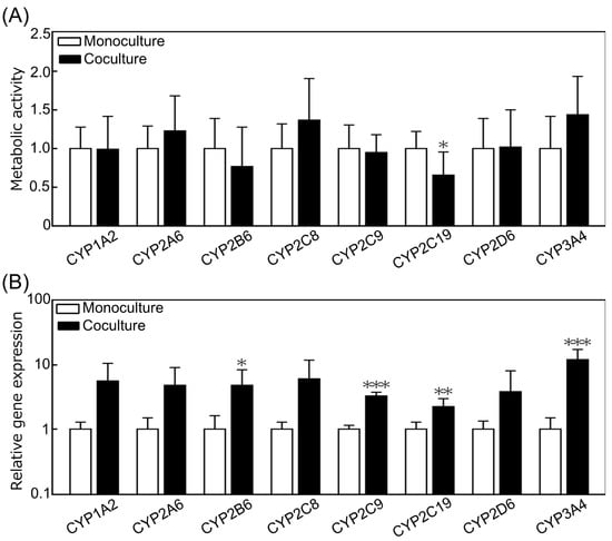 Figure 5. Evaluation of the coculture effects on the metabolic function of primary hepatocytes derived from chimeric mice with humanized liver tissues (PXB cells). (A) Metabolic activity of PXB cells normalized by monoculture using liquid chromatography–tandem mass spectrometry (LC-MS/MS). The metabolic activity of CYP2C19 was significantly decreased by coculture (n = 5–8). (B) The relative gene expression levels related to the metabolism of PXB cells tended to increase in coculture. Significant differences were observed in the expression levels of CYP2B6, 2C9, 2C19, and 3A4 (n = 7–18). Each value was normalized to that of the monoculture for each gene. Data represent the mean ± SD, * p < 0.05, ** p < 0.01, and *** p < 0.005.