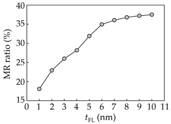 The MR ratio of the CPP-GMR reader versus tFL is presented in Figure 2. It shows that the MR ratio increases at thicker tFL. Above a tFL of 6 nm, a change in layer thickness has less impact on the MR ratio increment than below. An enhancement of bulk spin-dependent scattering contributed to an increase in MR ratio.