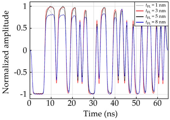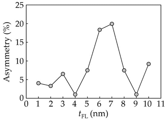 The asymmetry parameter of the readback signal obtained from the CPP-GMR reader was examined at different tFL, as shown in Figure 5. Most readers, except for those with a tFL of 6 and 7 nm, were found to contain under 10% readback signal asymmetry. The readback waveforms produced by the readers with a tFL of 4 and 9 nm are the most symmetric. From analysis of the readback signal, its dibit extraction, and its asymmetry parameter, it is obviously seen that the most suitable thickness of the free layer is 3 nm. The reader with this thickness value could provide the greatest pattern of readback signal.