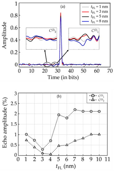 The dibit response of the readback signal was obtained though the 63-bit PRBS with the polynomial x6 + x5 + 1. The main echoes related to this response are C(2)1 and C(2)2, which are located at bits 27 and 22, respectively. These echoes typically indicate the non-linear distortion of the readback waveform due to reader asymmetry [37]. It is noted that the impacts of higher orders of echoes were dominated by these main echoes and can be neglected in the evaluations. Figure 4a demonstrates the examples of dibit extraction of the reader with tFL of 1, 3, 5, and 8 nm. Each echo is magnified in the insets. The readers having a tFL of 5 and 8 nm seem to have higher echo amplitudes than others. Further details of echoes’ amplitudes were, in addition, analyzed at all possible tFL, as shown in Figure 4b. When the tFL was increased starting from 1 nm, the amplitude of the echoes decreased until it reached its lowest scale. Then, the amplitude of echoes increased continuously when the tFL increased beyond the point providing the lowest echo amplitude. A variation of tFL appears to have a minor impact on C(2)1 and C(2)2 at a tFL above 6 nm, indicating a lesser affectation on the readback signal distortion for this specific range.