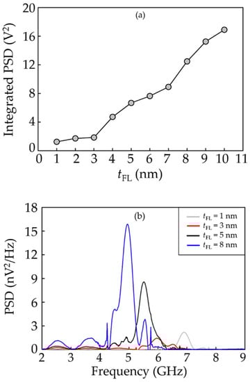 In addition, the PSD profile of the head response was characterized as another stability indicator for the reader. Figure 6a illustrates the integrated PSD at various tFL, while its frequency spectrum is indicated in Figure 6b. The PSD scale was found to be continuously lowered as the tFL was reduced from 10 to 3 nm. Below tFL = 3 nm, an adjustment of the tFL causes a slight change in PSD amplitude. Then, it is worth reducing the thickness of the free layer to 3 nm. The frequency spectrum of PSD of the readers with tFL of 1, 3, 5, and 8 nm is demonstrated in Figure 6b. Corresponding to Figure 6a, the amplitude of PSD becomes smaller at greater tFL. In particular, we found that the spectral peak is shifted to higher frequencies by decreasing the tFL. This frequency shifting behavior can be described by the magnetization precession which is computed by the LLGS equation [33,34]. The LLGS formula generally consists of the precession, damping, and spin torque terms. The spectral peak theoretically occurs depending mainly on the precession and damping terms of the time-varying magnetization. As the tFL is reduced, the spin torque term in which its direction is opposing the magnetization precession becomes higher. This accordingly causes an enhancement of the force pulling the magnetization towards the opposite direction to its initial state. The resulting force therefore yields the higher oscillation of the magnetization precession. Rather than the frequency shifting, the higher PSD intensity at greater tFL indicates a stronger impact on the reader stability, as this typically implies less stable magnetization precession and may further reduce the signal-to-noise ratio of the read sensors.