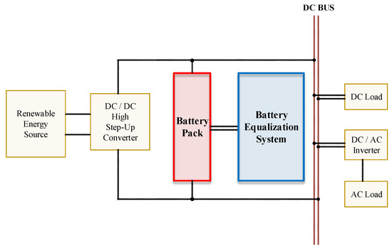 Energy conservation and reduction of carbon dioxide to avoid the greenhouse effect are the goals of clean and green energy promoted by countries all over the world today. Batteries are an important part of clean and green energy technology and are consistent with this goal. The architecture of a renewable energy system is shown in Figure 1. The battery pack not only supplies power to the DC load through the DC bus, but also supplies power to the AC load through the inverter. Due to the high conversion efficiency of batteries, which is far better than the internal combustion engine of gasoline vehicles (GV) [1], the electric vehicle (EV) industry has developed rapidly and has become a hot topic in recent years. On the other hand, portable and wearable storage products are popular development trends for electronic products. Therefore, batteries are also necessary and indispensable components in mobile devices and wearable devices, and their importance is self-evident. The voltage level of the battery is not sufficient to power portable and wearable storage products; for example, the voltage inside a single cell of a Li-ion battery, a lead–acid battery, and a Ni–MH battery is 3.3 V~3.7 V, 2.4 V~2.8 V, and 1.2 V, respectively [2,3,4,5,6]. This means that batteries need to be connected in series to effectively power portable and wearable storage products. For instance, there are 7104 Li-ion cells in a Tesla Model S EV, and these supply 400 V to the motor [7].
