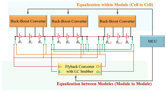 The proposed battery equalizer system with hierarchical equalization charging topology (HECT) is shown in Figure 2. This system is comprised of the equalizer-within module (EWM), the equalizer between the modules (EBM), and the master control unit (MCU). The main components of the proposed battery equalizer system are introduced as follows.