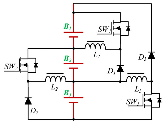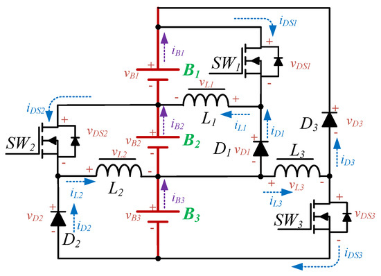 The current path of the redistribution stage in Mode 3 is shown in Figure 7. In Figure 7a, the power switch SW3 is turned on, and the battery B3 provides energy to the inductor L3 through SW3. In Figure 7b, the switch SW3 is turned off, and the inductor L3 supplies energy to batteries B1 and B2.