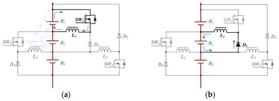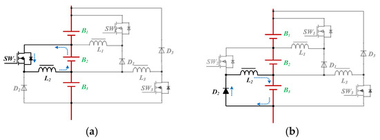 The current path of the concentration stage in Mode 2 is shown in Figure 6. Similar to Mode 1, in Mode 2, the energy transferring between batteries B2 and B3 is shown in Figure 6a,b, respectively.