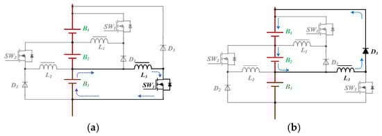 The current path of the concentration stage in Mode 1 is shown in Figure 5. In Figure 5a, switch SW1 is turned on, and inductor L1 is charged by the battery B1. In Figure 5b, switch SW1 is turned off, and the inductor L1 provides energy to the battery B2. Thus, the energy is unidirectional shifted from B1 to B2.