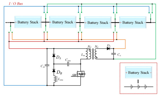 Each individual battery has slightly different characteristics, in terms of manufacturing tolerances or usage conditions, such as inherent resistance, capacity, and life cycle. The unbalance of the series-connected battery will be very serious after many times of charging and discharging [8]. When the battery is in undercharged or overcharged condition, it can cause battery breakdown or even a thermal runaway. Therefore, when the battery is charging or discharging, a battery balancing system is needed to average all of the voltages of the battery in series connection to ensure its safety [9]. To ensure safety and optimize performance, all batteries need to be monitored by an electronic battery management system (BMS) [10,11]. Many equalizing methods for batteries have been proposed [12,13,14]. In terms of hardware, battery equalizers can be classified as dissipative (passive) and non-dissipative (active) types.