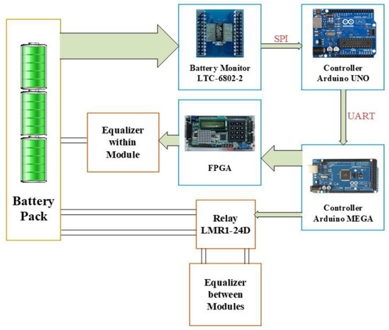 The control architecture of the proposed equalizer system is shown in Figure 9. The controller includes the battery monitor LTC-6802-2, center micro controller unit Arduino UNO and multiplexed controller Arduino MEGA and FPGA. In addition, the battery monitor is responsible for showing the real-time status of cell equalization.