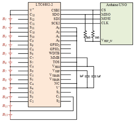 The circuit diagram of LTC-6802-2 connected with the Arduino UNO.