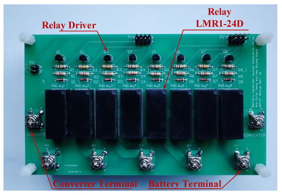 For a large number of cells, the controller system is divided into three parts. The battery voltage data is collected by the battery monitor LTC-6802-2, and then transmitted to the central controller Arduino UNO through the SPI interface. The circuit diagram of LTC-6802-2 connected with the Arduino UNO is shown in Figure 10. In addition, the battery data will be displayed on the monitor at the same time, and then sent from Arduino UNO to the Arduino MEGA through the UART interface. Arduino MEGA arranges and specifies the battery to be balanced, and then Arduino MEGA and FPGA send gate-driving signals to each power switch for controlling the equalizer within module. Meanwhile, the Arduino MEGA sends commands to the Relays (LMR1-24D) for controlling the equalizer between module. In addition, the photo of the utilized relays (LMR1-24D) along with the relay drivers in the proposed battery equalization system is shown in Figure 11. The flow charts of the control program for EWM and EBM are shown in Figure 12 and Figure 13, respectively.