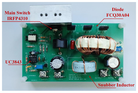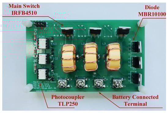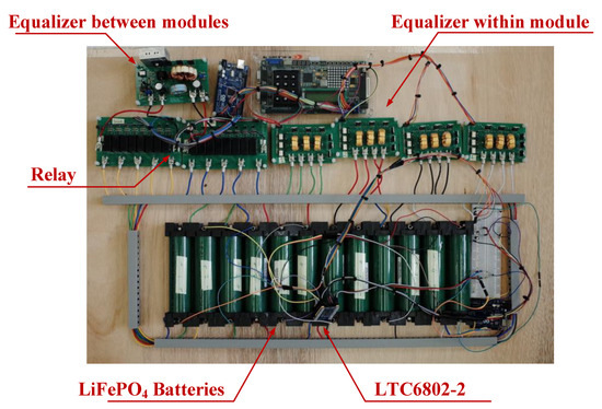 Twelve LiFePO4 batteries with uneven battery voltage are applied to the proposed battery equalization system with hierarchical equalization charging topology to demonstrate the function, and the circuit photo of the overall proposed battery equalization system is shown in Figure 18.