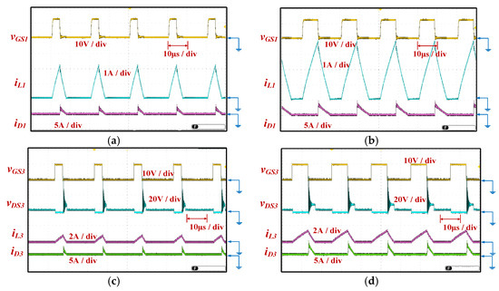 Figure 15a,b respectively show the gate-driving signal vGS1 with 20% and 40% duty cycle of the power switch SW1, the current iL1 of the inductor L1, and the current iD1 of the diode D1.