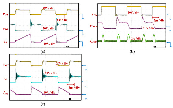 Figure 17a exhibits the gate-driving signal vGS and voltage vDS of the main switch SW, and the leakage inductor current ilk. Figure 17b shows the gate-driving signal of switch SW, the voltage vCsnu of the snubber capacitor Csnu, and the current iLsnu of the snubber inductor Lsnu. Although there is a spike voltage caused by leakage inductor and parasitic capacitance Cds of SW, the energy can be recovered to input and output via the snubber circuit. The experimental waveforms of diode D3 are depicted in Figure 17c, which include diode voltage vD3 and current iD3 along with the gate-driving signal vGS.